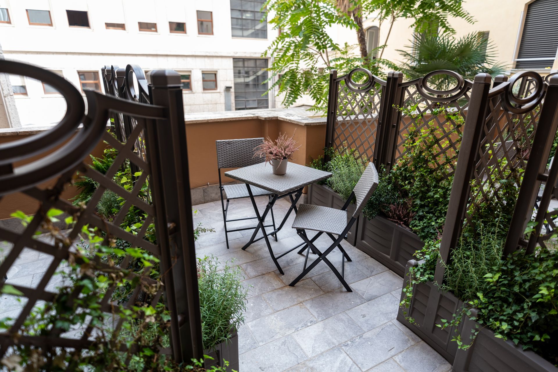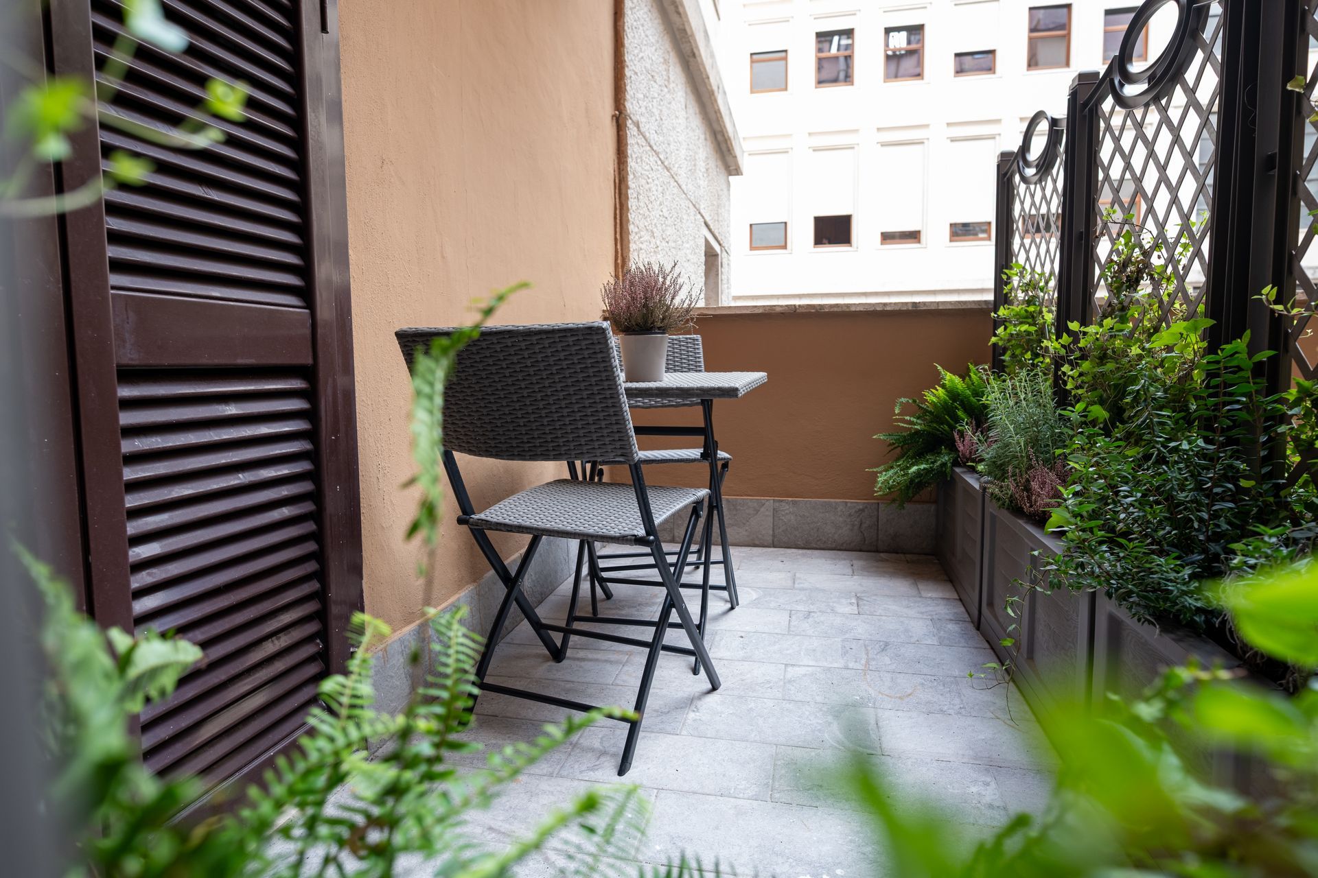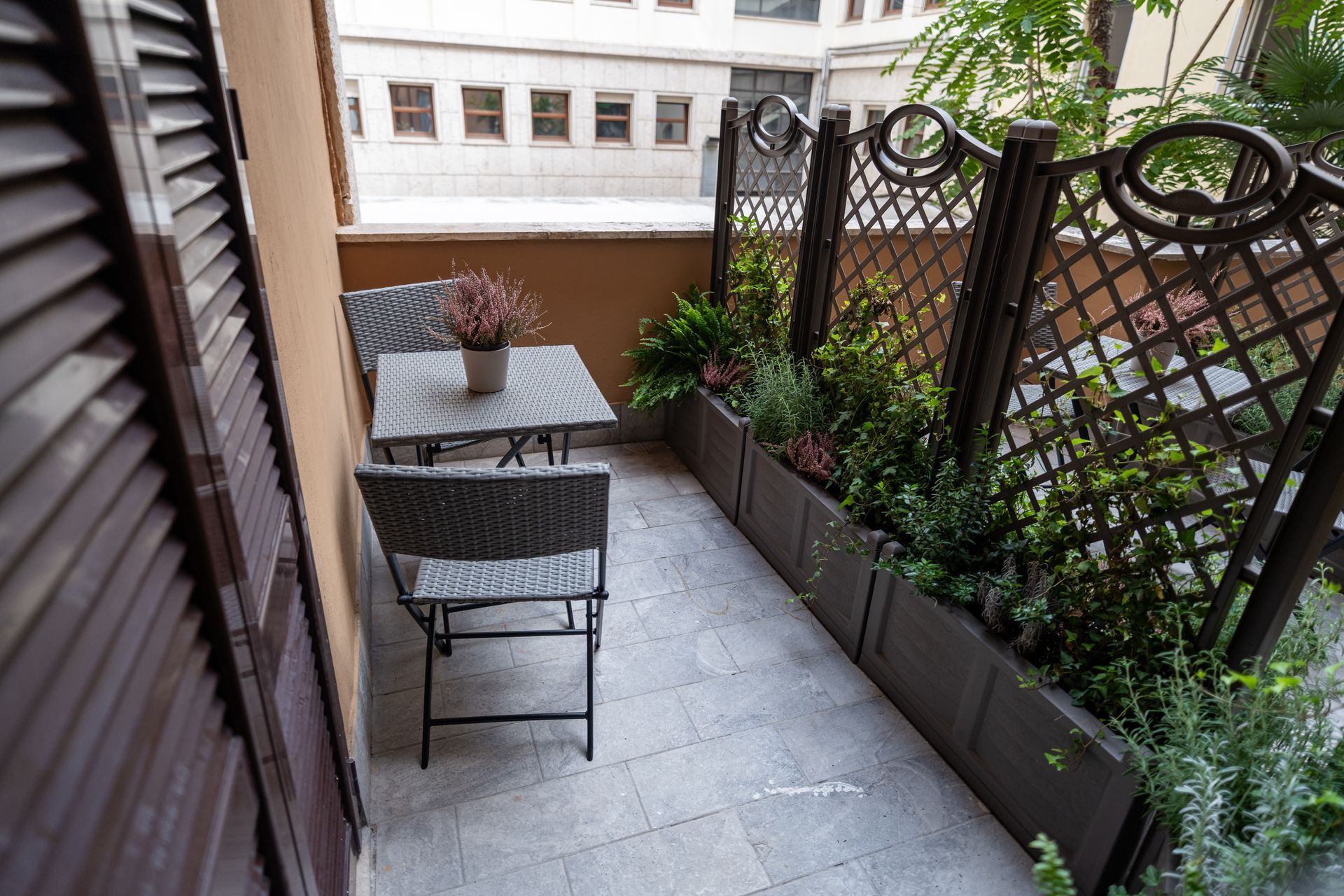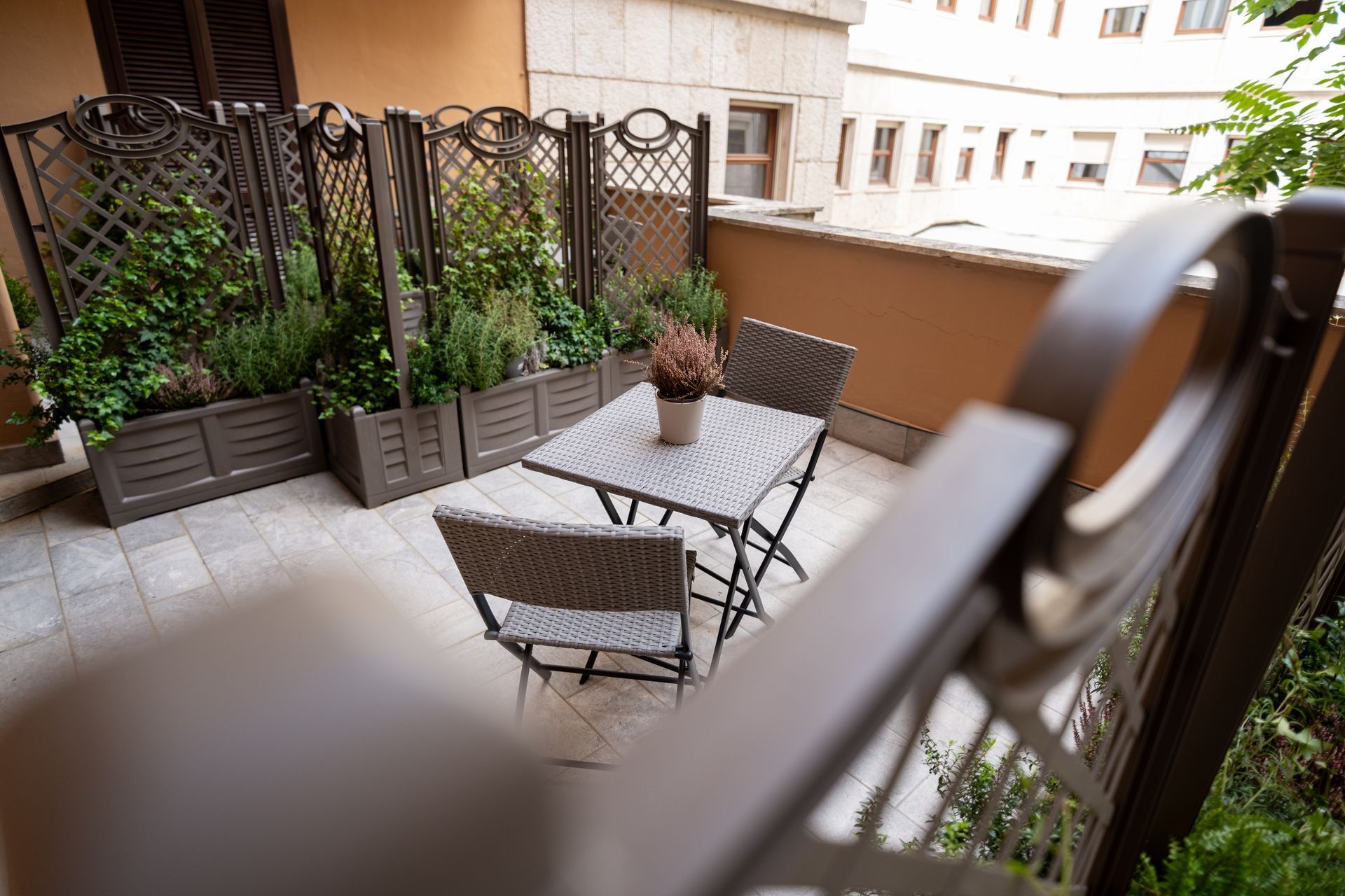 La Camera 6 combina comfort e design moderno. Il terrazzino privato, arredato con due sedie e un tavolino, offre uno spazio esterno ideale per momenti di relax. All’interno, la camera dispone di letto matrimoniale, TV a schermo piatto, minibar, scrivania e bagno privato con doccia. L’arredamento essenziale e i colori neutri donano equilibrio e luminosità all’ambiente.