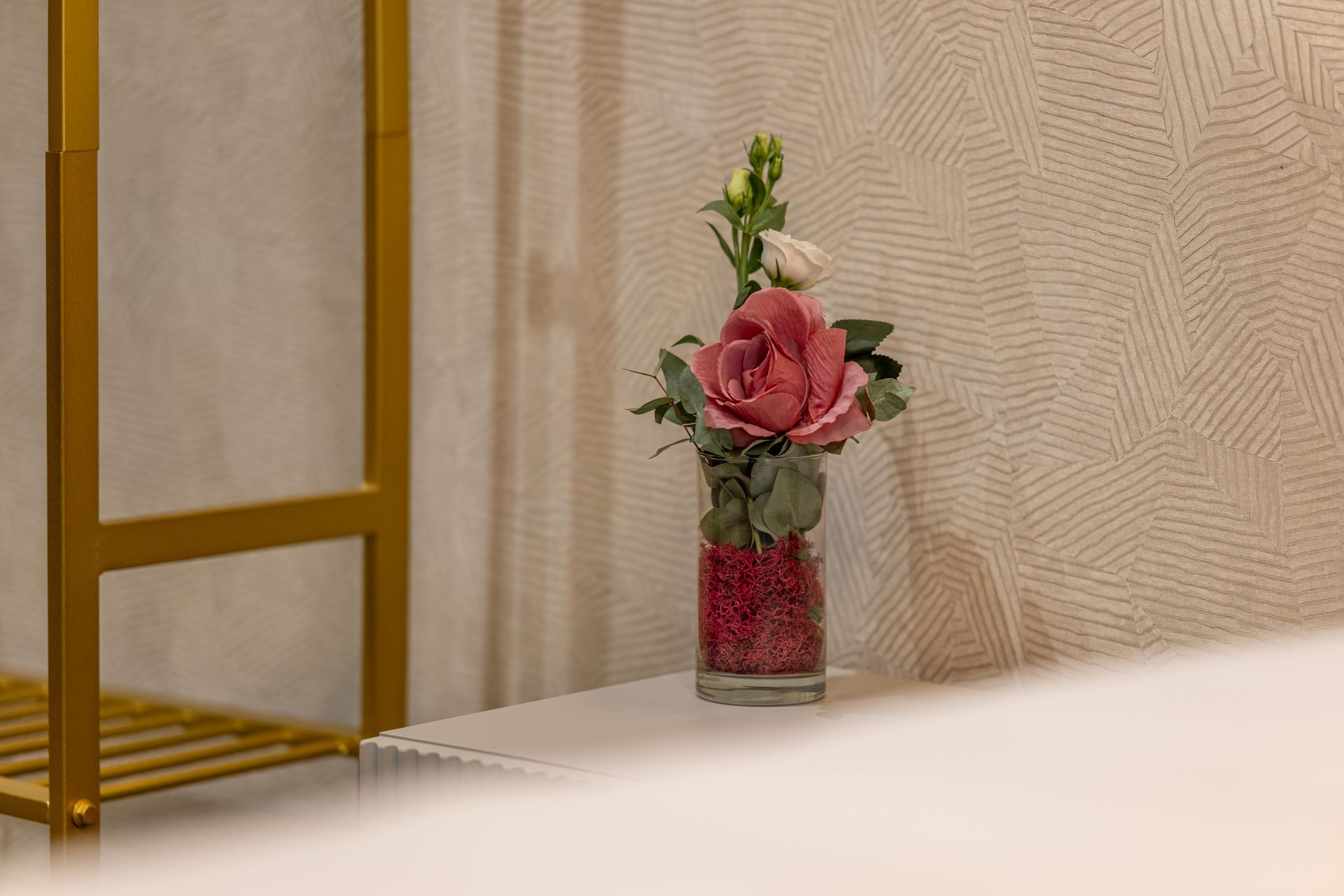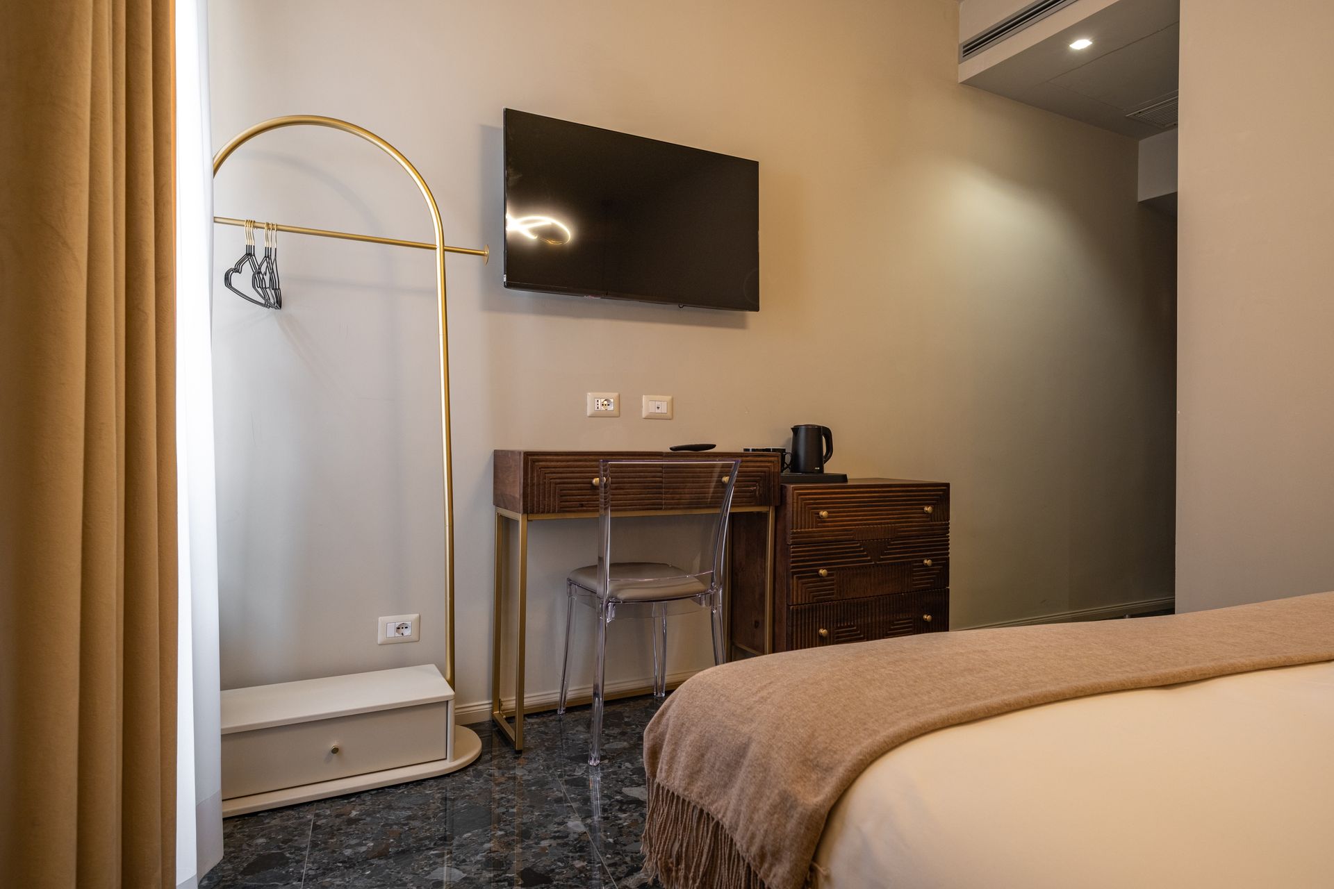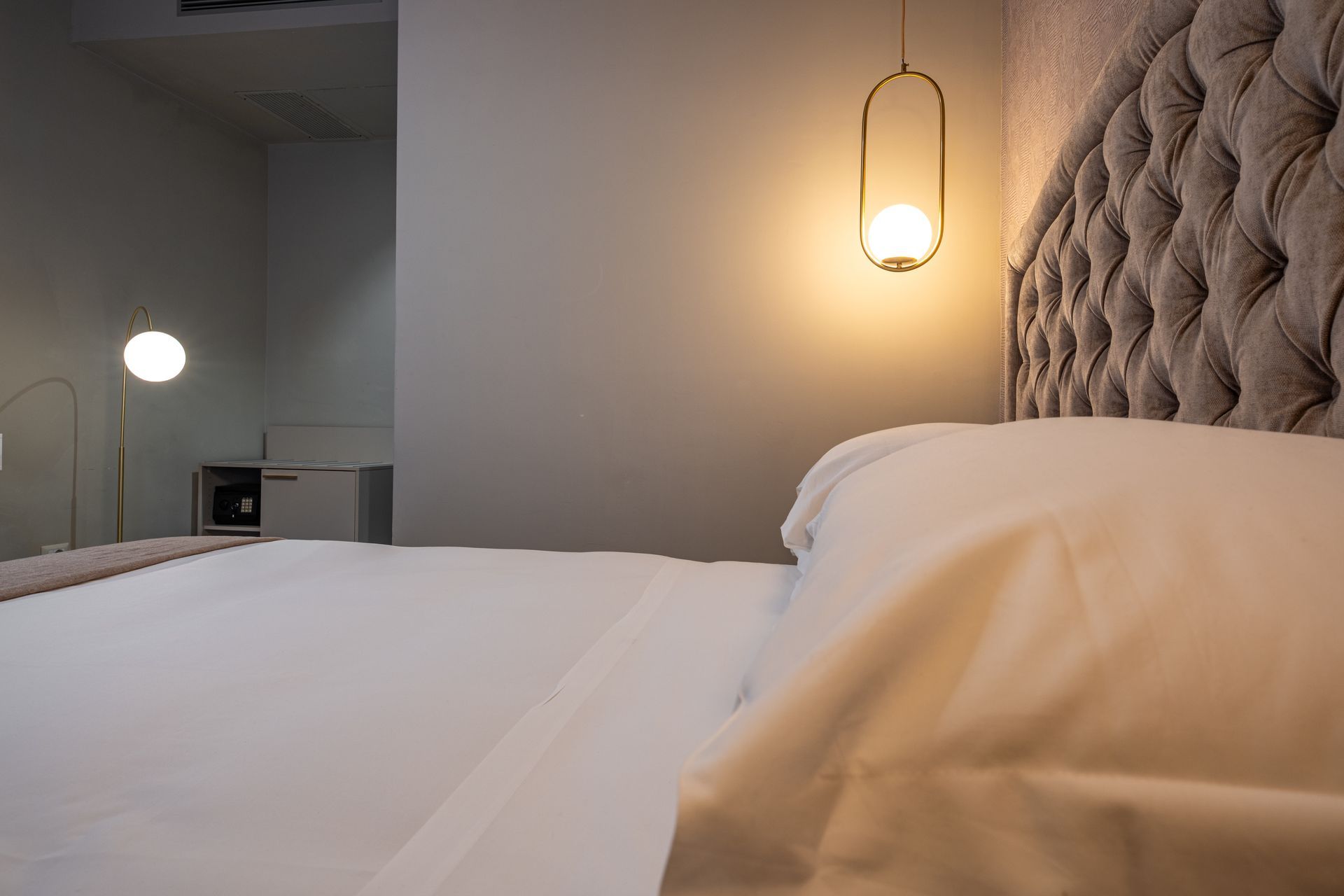 Arredata con gusto contemporaneo e tonalità neutre, la Camera 2 offre comfort e tranquillità con vista su Via Sicilia. Dispone di letto matrimoniale con biancheria di qualità, testiera imbottita e illuminazione calda e diffusa. Pavimento in marmo e tende oscuranti completano un ambiente curato nei dettagli. Bagno privato con doccia e set di cortesia.