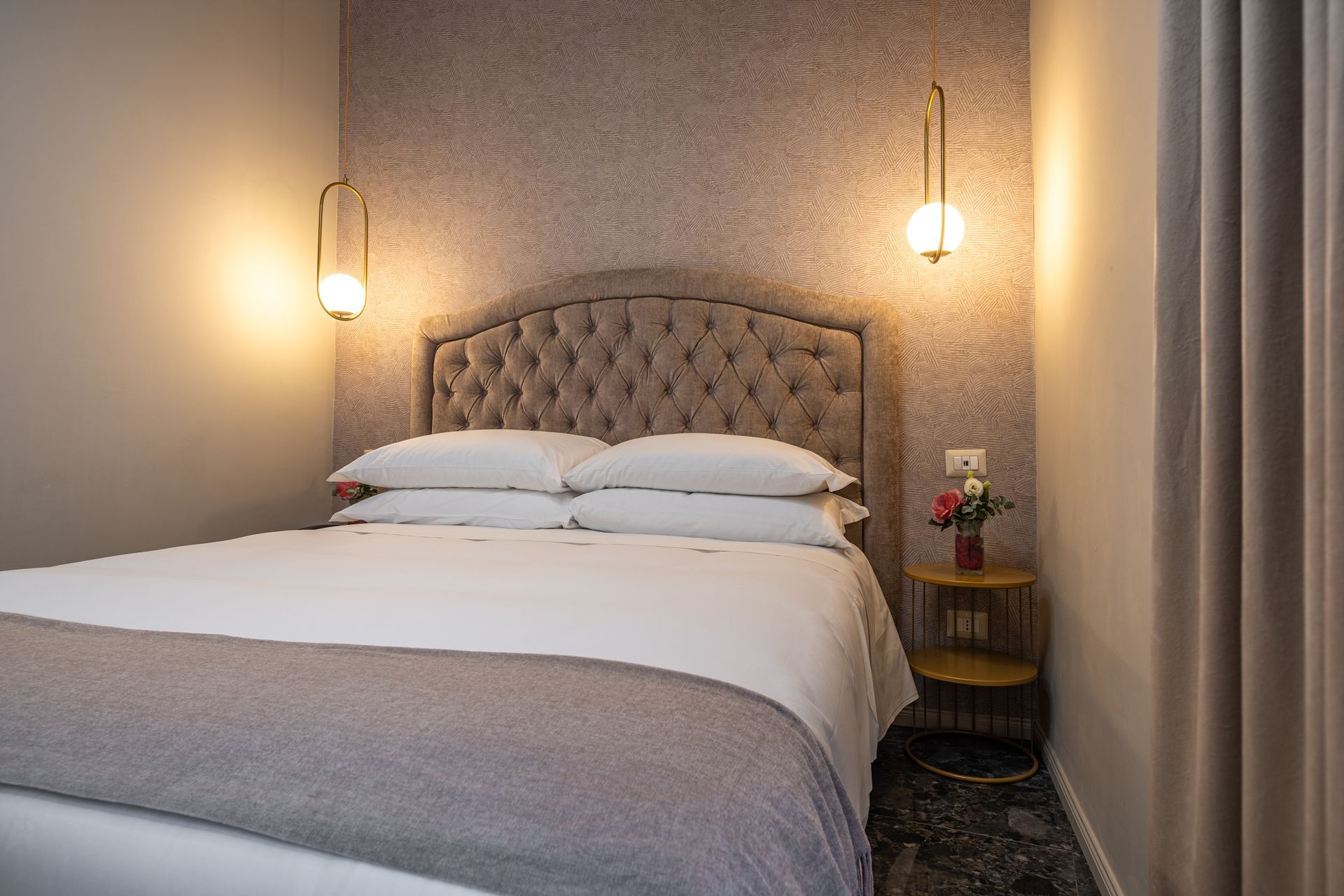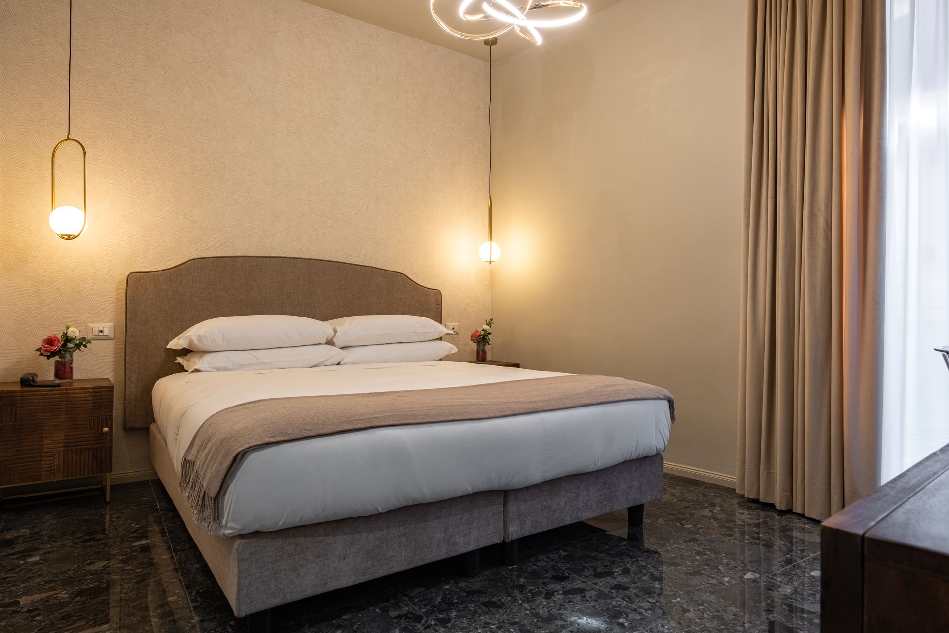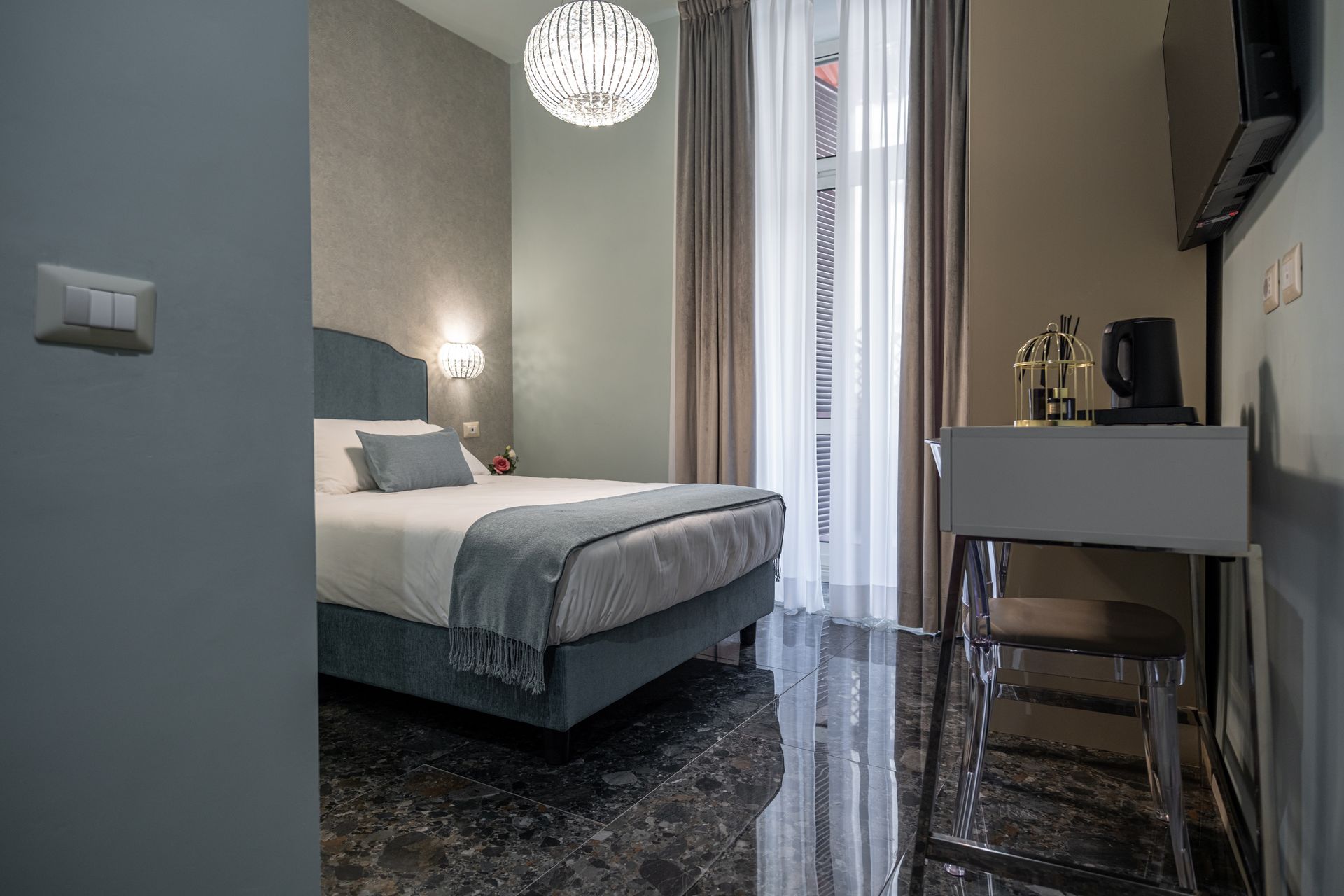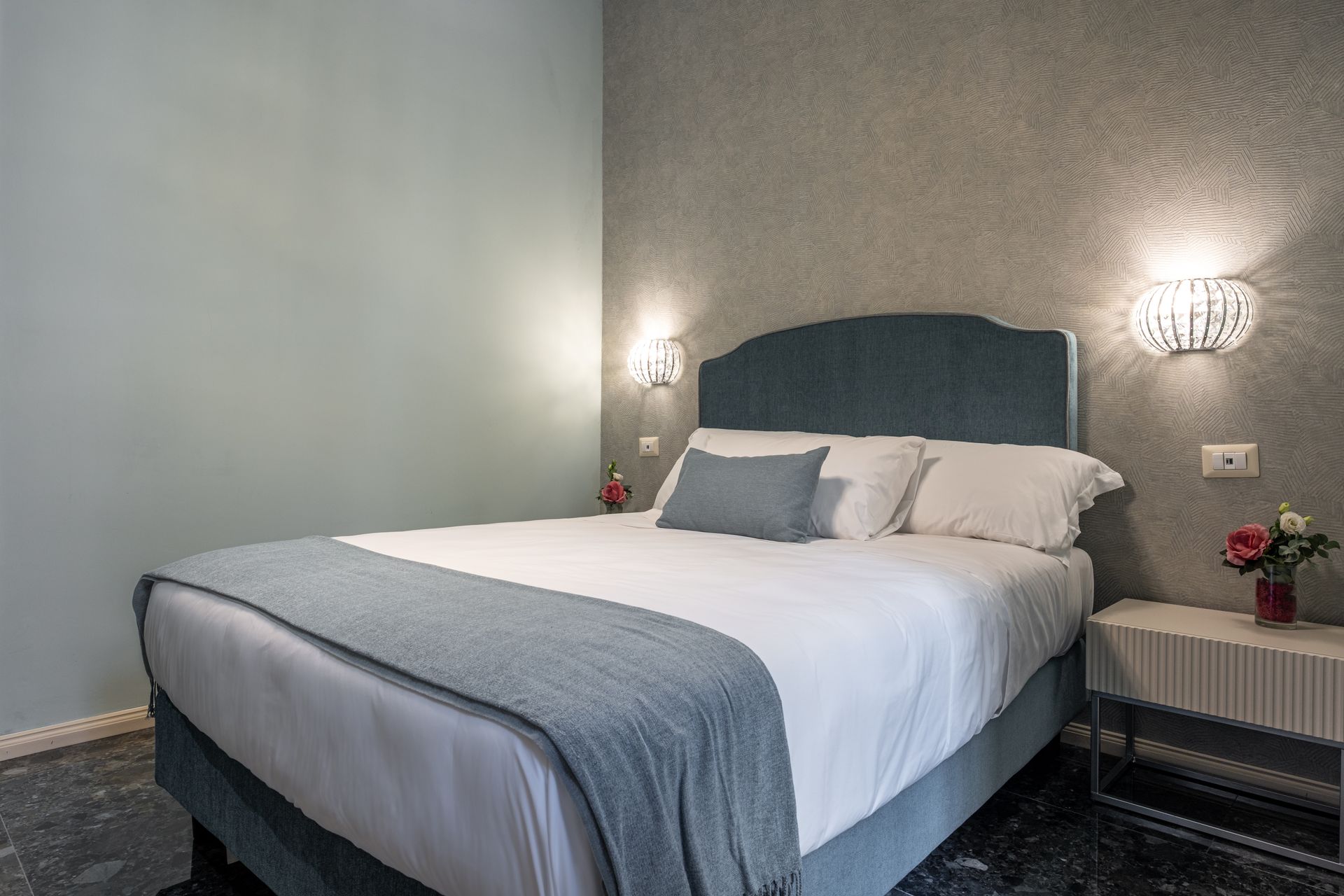 Elegante e confortevole, la Camera 1 si affaccia su Via Sicilia e offre un ambiente accogliente in stile moderno. È dotata di letto matrimoniale con testiera imbottita, biancheria di alta qualità, illuminazione soffusa con lampade a sospensione e pavimento in marmo scuro. Le tende doppie permettono di modulare la luce naturale, creando un’atmosfera rilassante. Bagno privato con doccia e set di cortesia.
