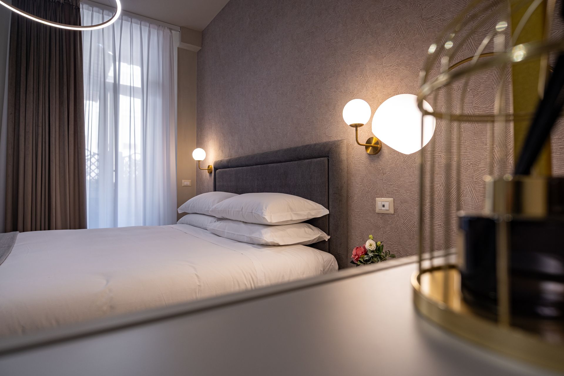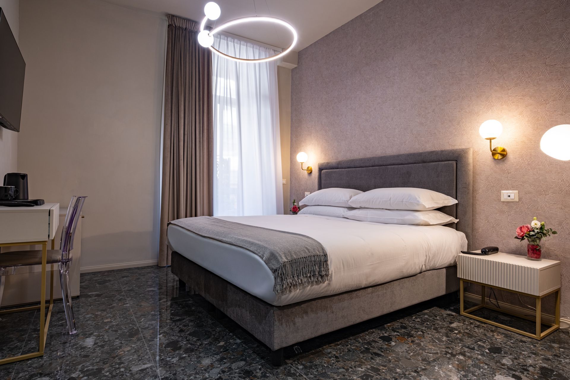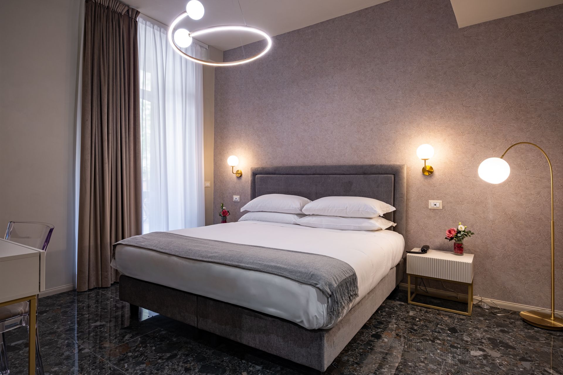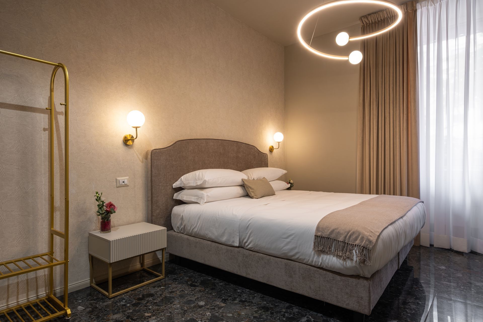 Elegante e confortevole, la Camera 1 si affaccia su Via Sicilia e offre un ambiente accogliente in stile moderno. È dotata di letto matrimoniale con testiera imbottita, biancheria di alta qualità, illuminazione soffusa con lampade a sospensione e pavimento in marmo scuro. Le tende doppie permettono di modulare la luce naturale, creando un’atmosfera rilassante. Bagno privato con doccia e set di cortesia.