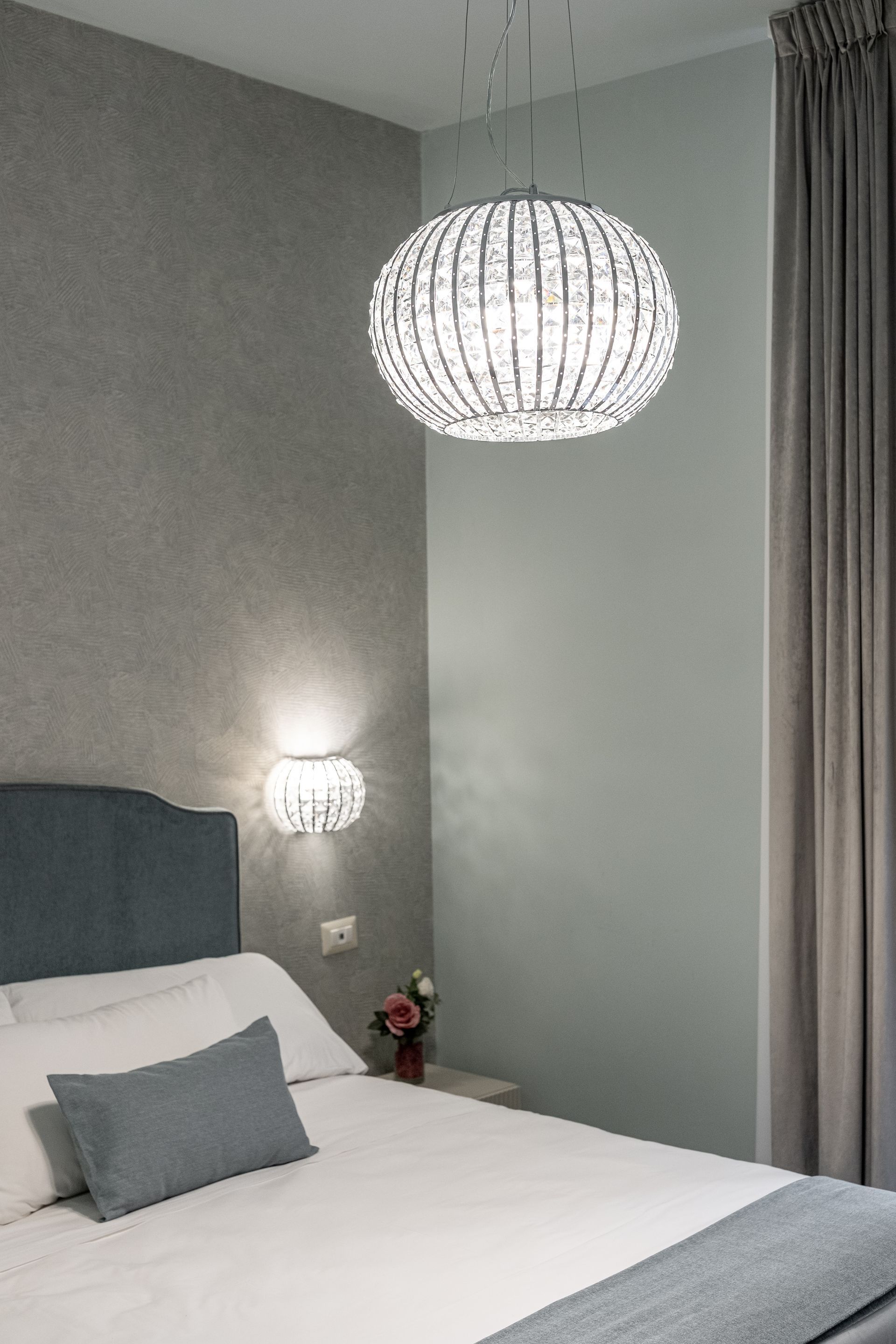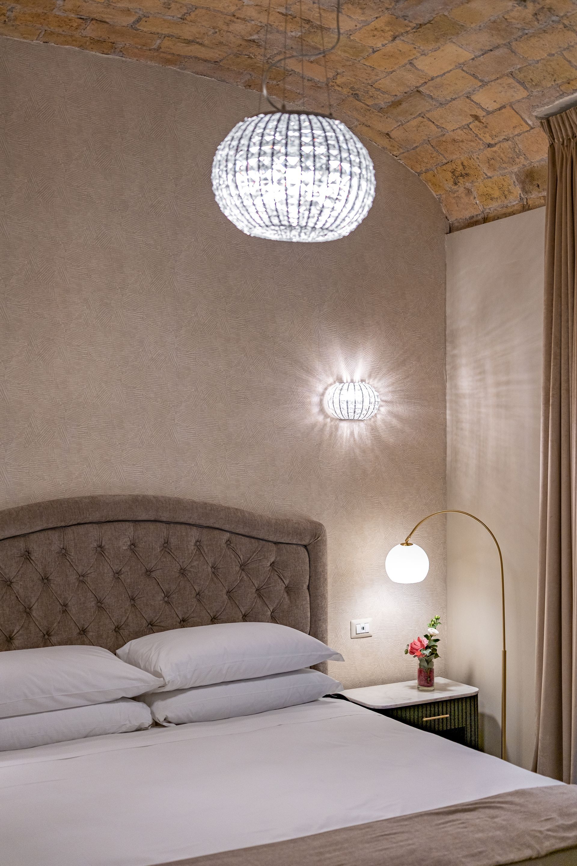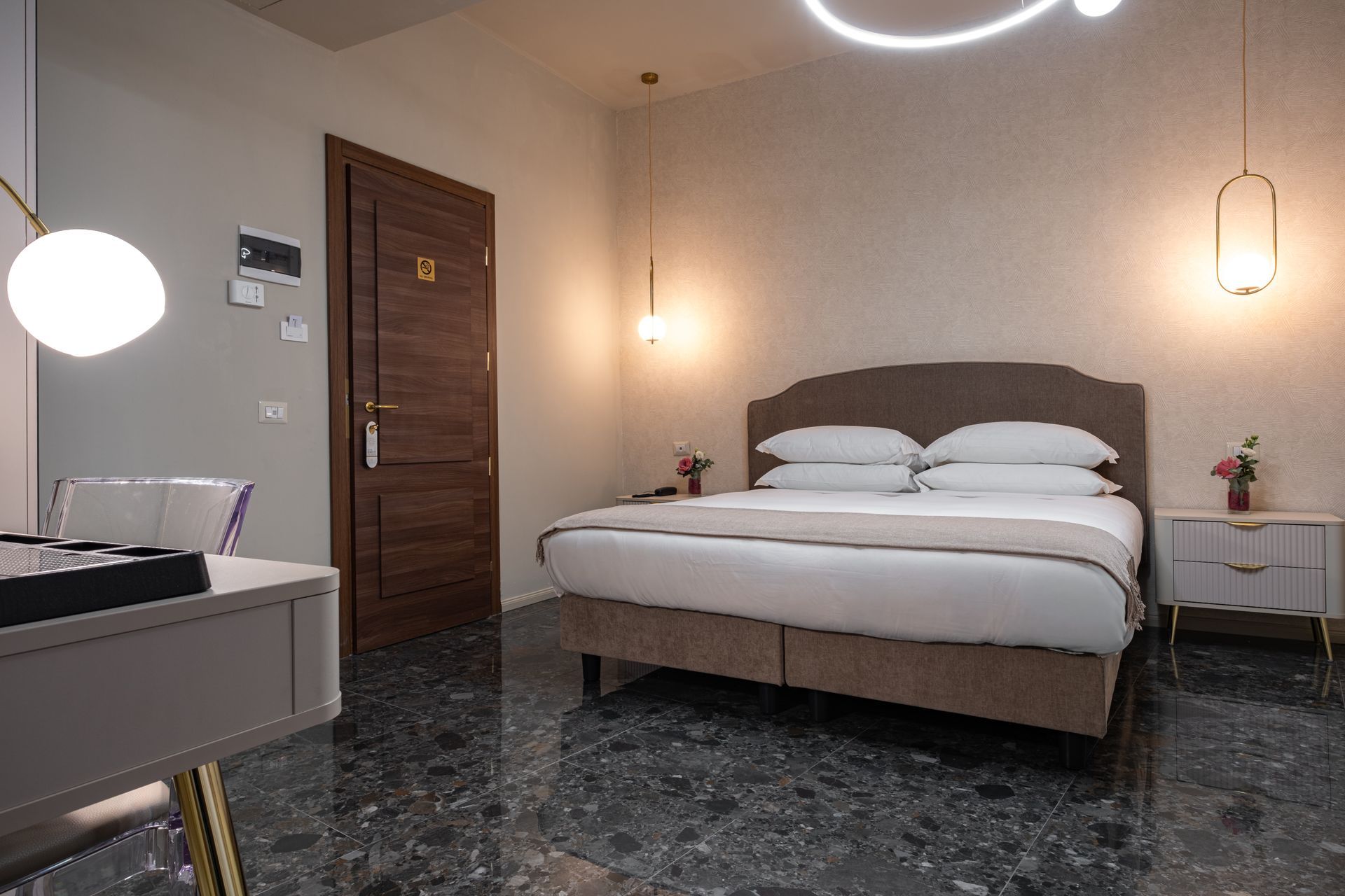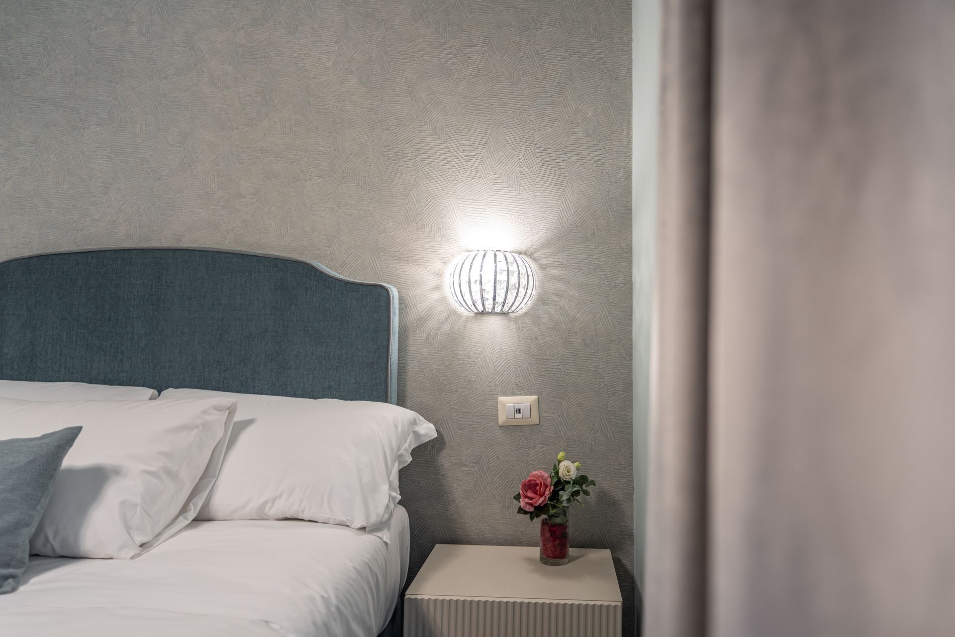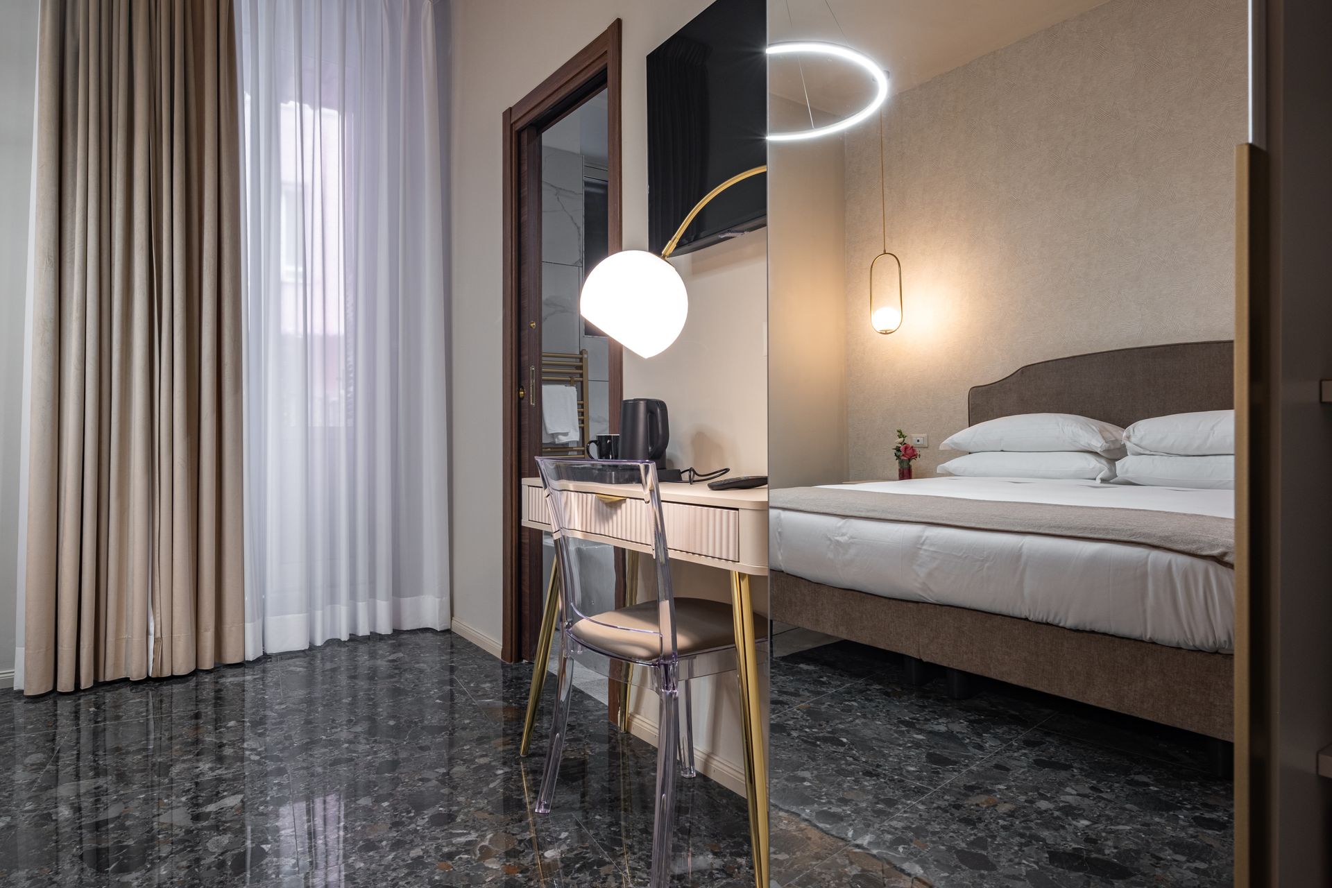 Elegante e confortevole, la Camera 1 si affaccia su Via Sicilia e offre un ambiente accogliente in stile moderno. È dotata di letto matrimoniale con testiera imbottita, biancheria di alta qualità, illuminazione soffusa con lampade a sospensione e pavimento in marmo scuro. Le tende doppie permettono di modulare la luce naturale, creando un’atmosfera rilassante. Bagno privato con doccia e set di cortesia.