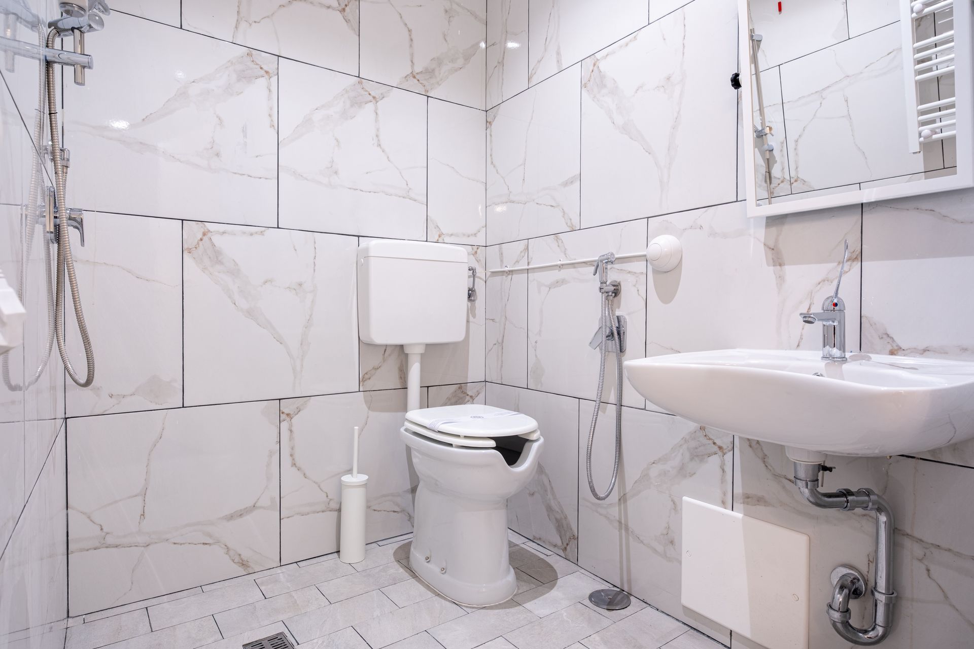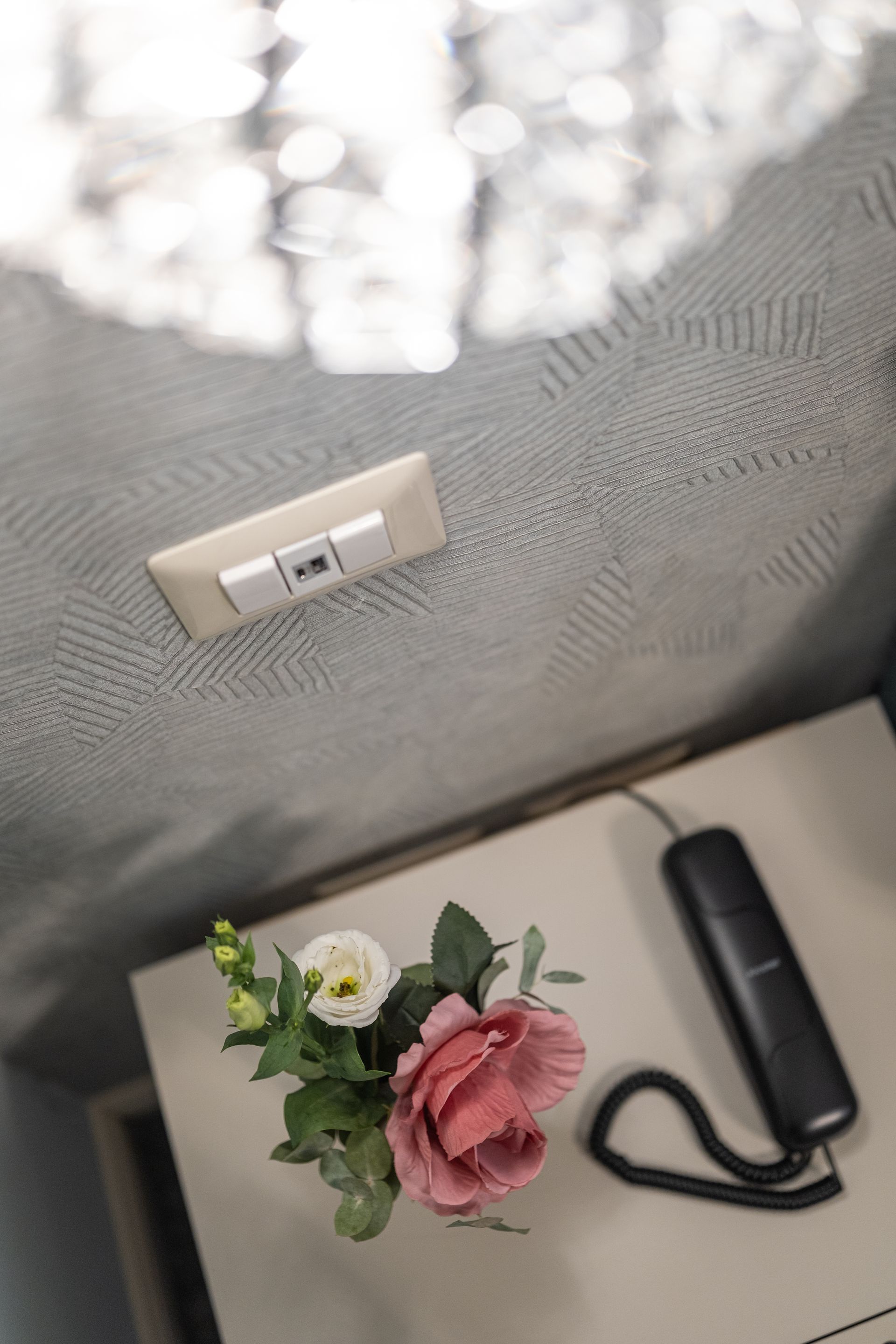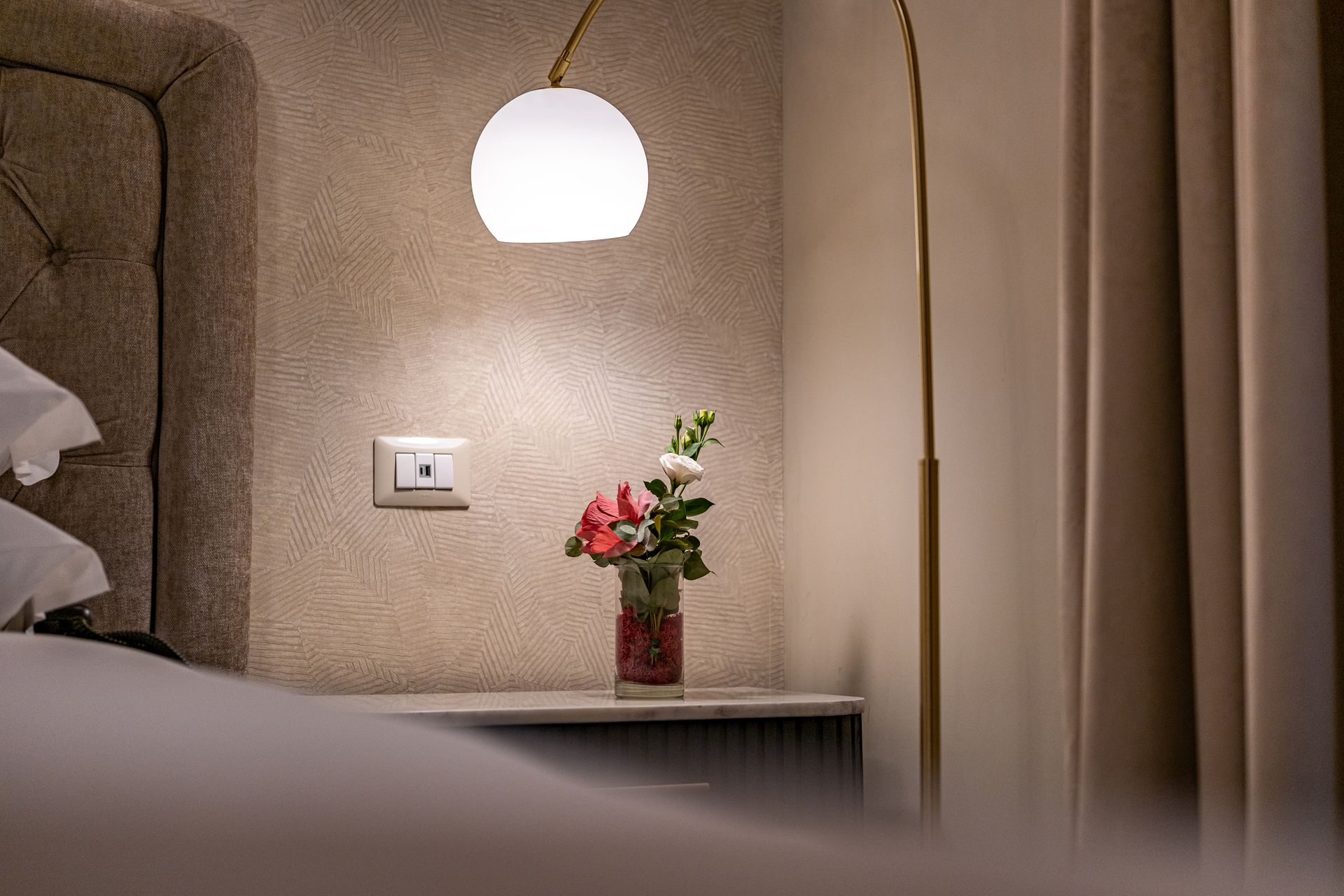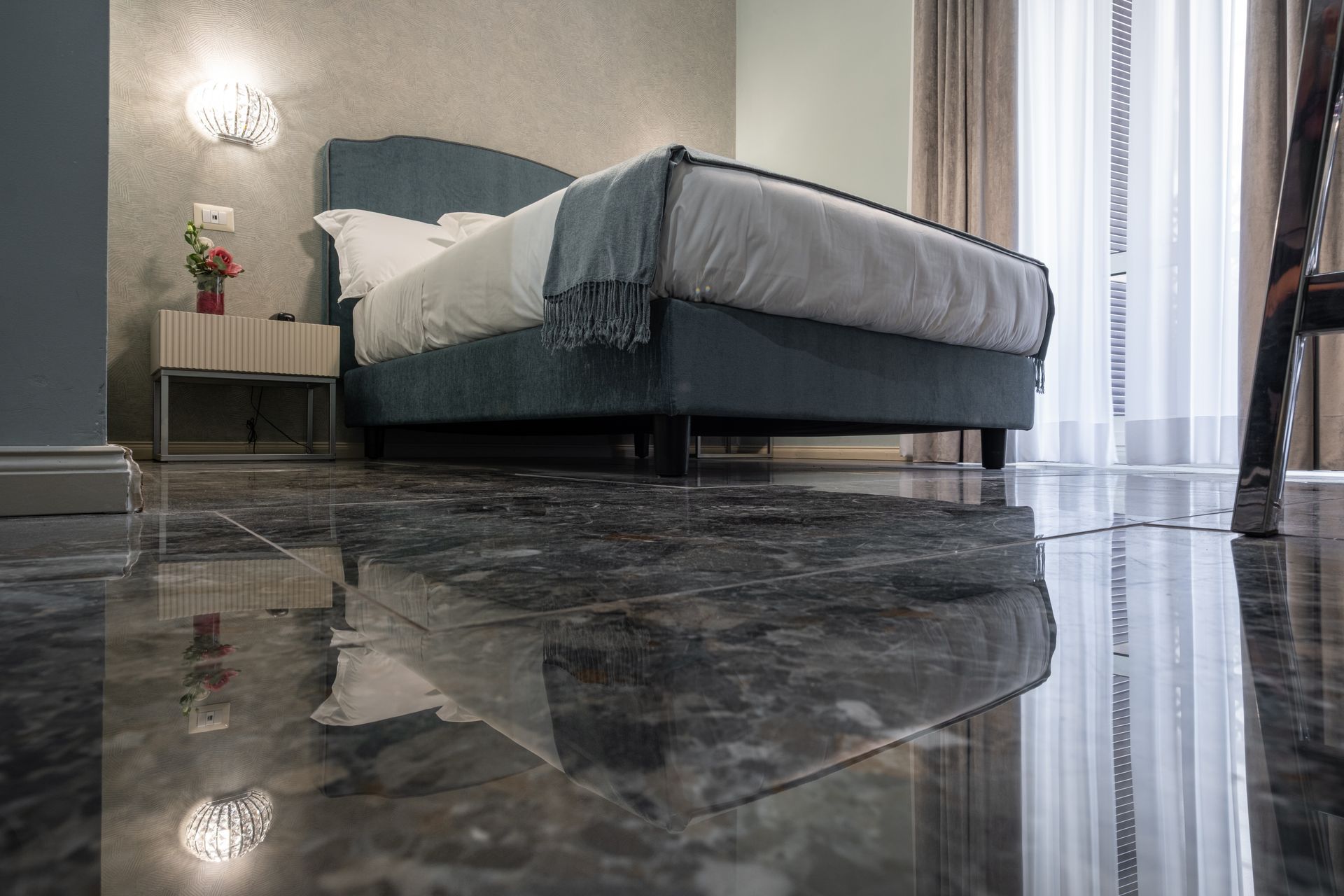 Elegante e confortevole, la Camera 1 si affaccia su Via Sicilia e offre un ambiente accogliente in stile moderno. È dotata di letto matrimoniale con testiera imbottita, biancheria di alta qualità, illuminazione soffusa con lampade a sospensione e pavimento in marmo scuro. Le tende doppie permettono di modulare la luce naturale, creando un’atmosfera rilassante. Bagno privato con doccia e set di cortesia.