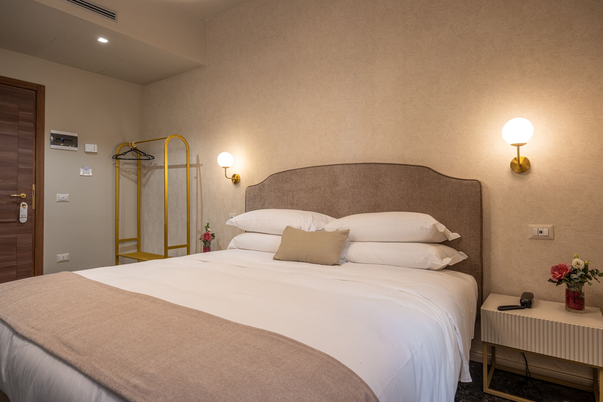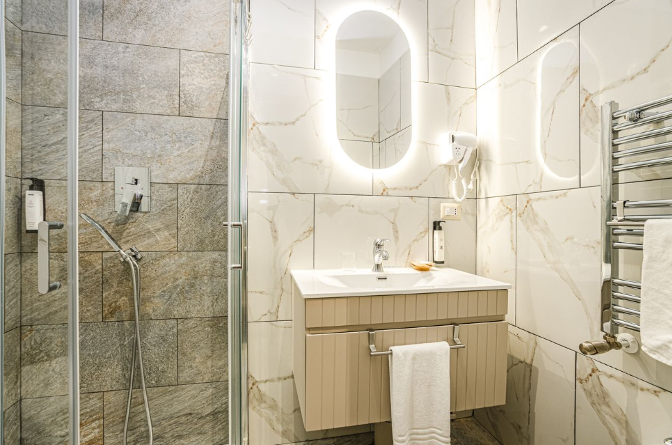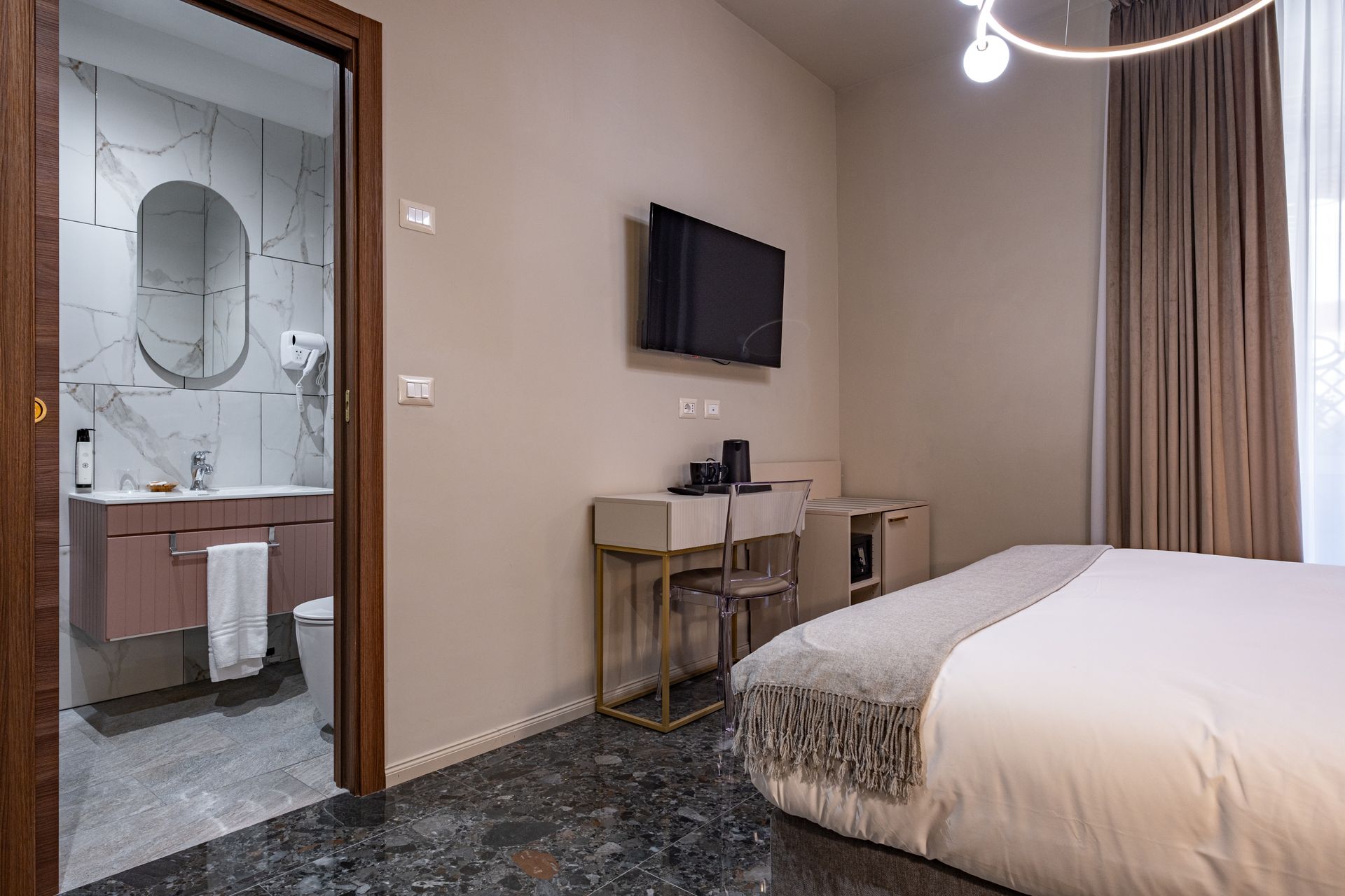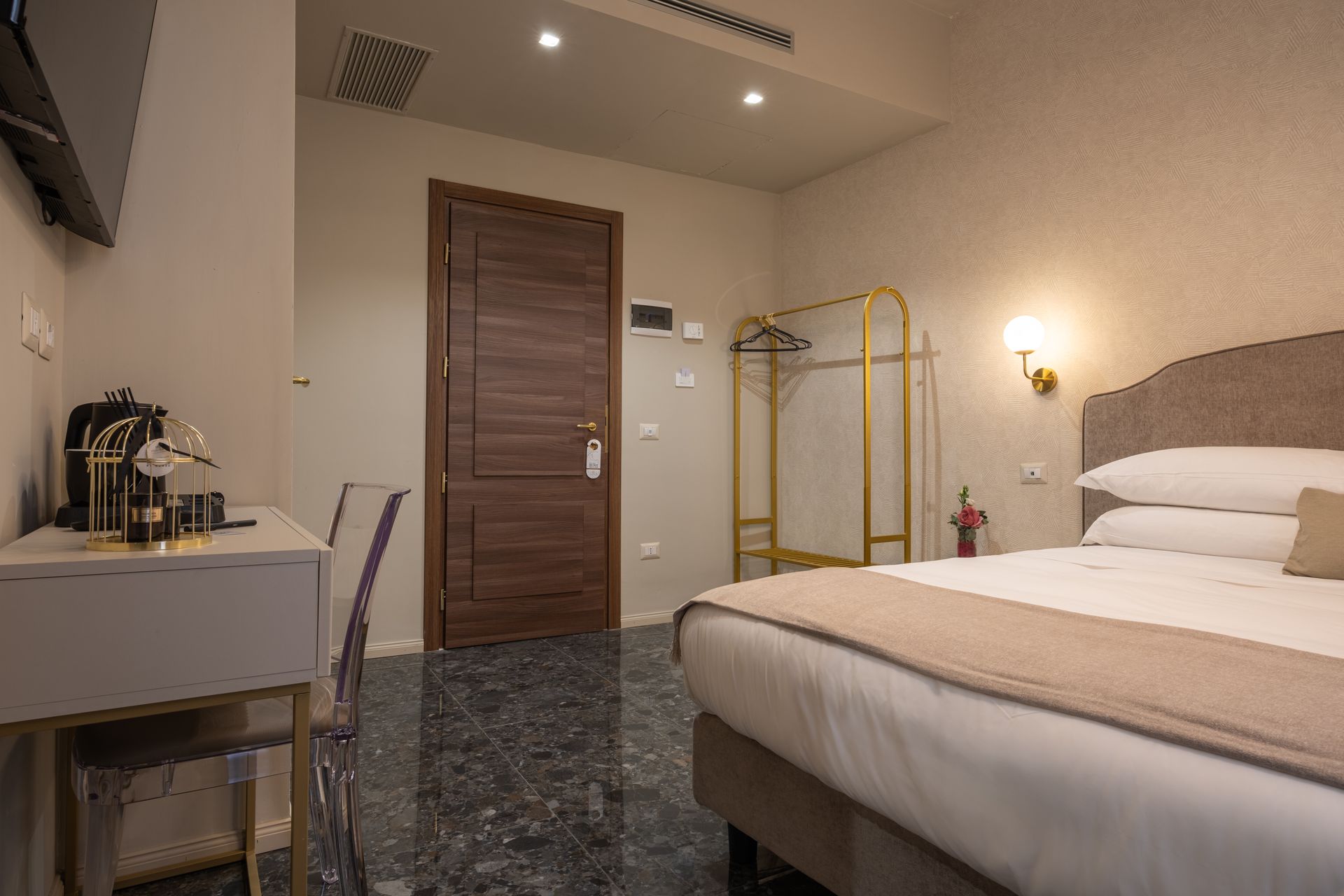 Camera intima e confortevole, arredata in stile contemporaneo con tonalità calde e dettagli eleganti. Dispone di letto matrimoniale, biancheria di qualità, TV a schermo piatto, minibar e bagno privato con doccia e set di cortesia. L’affaccio diretto sul terrazzo regala luce naturale e un’atmosfera rilassante